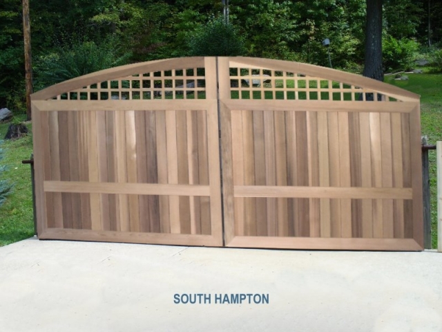 Our South Hampton style wooden driveway gate with lattice top and V-joint bottom.